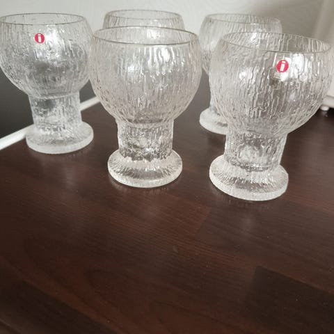 Iittala Kekkeri sarjan lasit, kirkas väri, lasimateriaali. Sarja sisältää useita laseja, joissa on teksturoitu pinta ja jalallinen muotoilu.