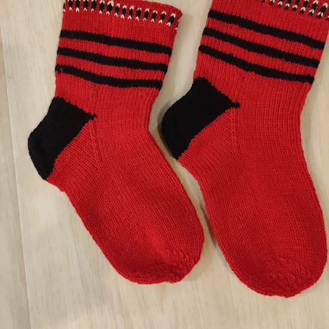 Käsin neulotut villasukat, monivärinen kuviointi, valmistettu villalangasta. Koko n 38-40, jalkaterän pituus kantapäästä n 25cm, vahvistettu kantapää.