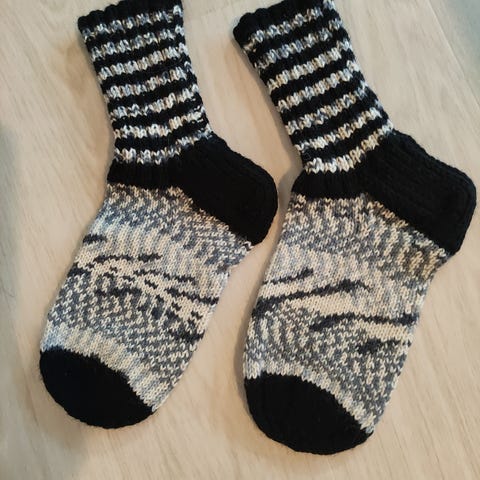 Käsin neulotut villasukat musta harmaa valkoinen koko 38-40