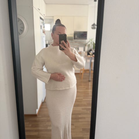 Beige neule, jossa pidempi kangasosa. Koristeellinen selkä. Koko M/L