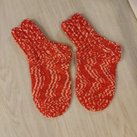 Raidalliset villasukat, käsin neulottu villalangasta. Sukat ovat mustapohjaiset ja niissä on moniväriset raidat. Koko n 34, jalkaterän pituus kantapäästä n 22cm, vahvistettu kantapää.