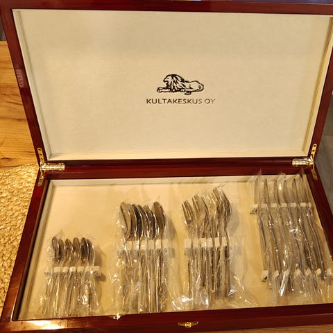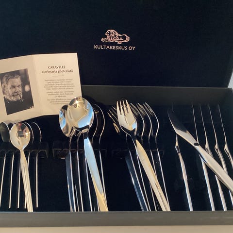 Tarjolla uusi 4-osainen Tapio-sarjan aterinsetti puulaatikossa, valmistaja Kultakeskus. Aterimien kunto täysin uuden veroiset, käyttämättömät.