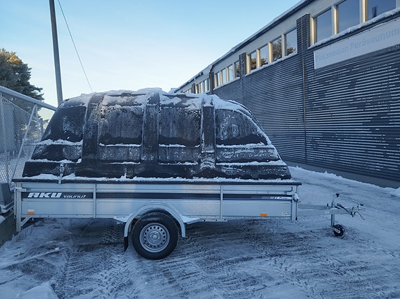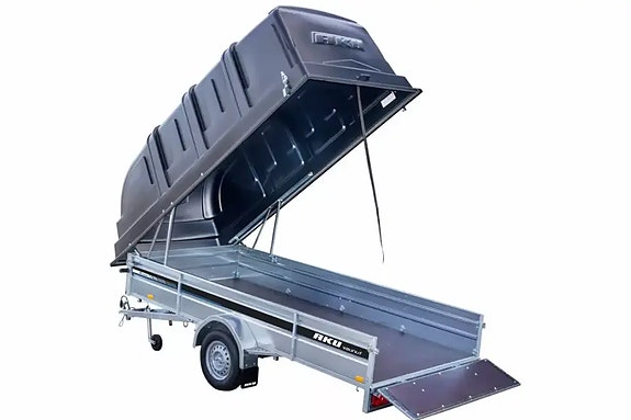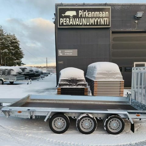 Leveä jykevä ajoramppi takana, helppo ajaa koneet kyytiin. Kevennetty rampin lasku/nosto jousella.