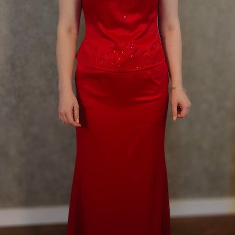 Upea, paljetein koristeltu ilta- tai juhlapuku naisille, koko XL. Puvun rinnanympärys on 104 cm ja pituus 142 cm. Puvussa on tyllihelma. Pukua on käytetty vain kerran. Sitä on säilytetty pukupussissa, joten se on puhdas ja hajuton. Puvun mukana on samaa kangasta oleva huivi.