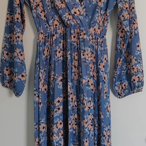 Naisten sininen kesämekko, koko L, kukkakuviolla. Mekossa on olkaimet, lyhyet hihat ja se on valmistettu polyesteristä. Sopii kesään.