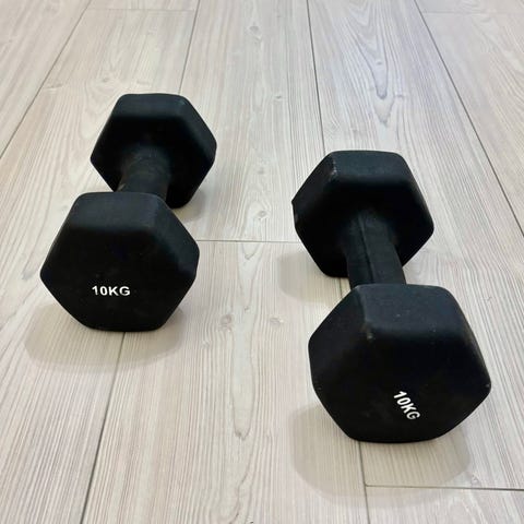 Muoviset täytettävät käsipainot, vedellä täytettynä painaa kolmisen kiloa, toinen tällä hetkellä täytetty hiekalla ja paino reilut 5kg.