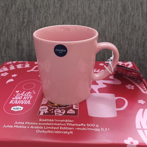 Kaikon vaaleanpunainen kuppi. Käyttämätön. Tilavuus 2,5-3dl välillä. Näitä valmistettu ilmeisesti vain rajallinen erä eikä ole ollut laajassa tuotannossa.