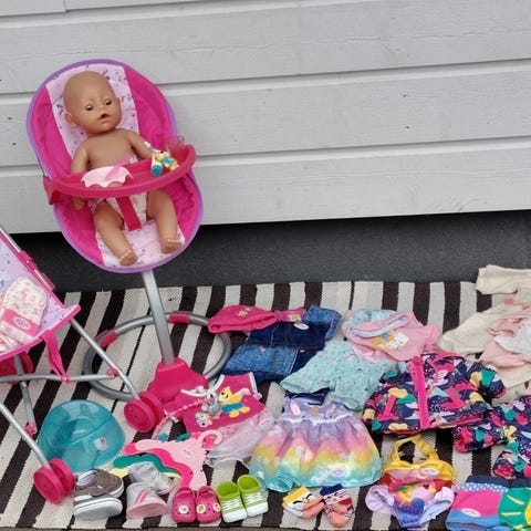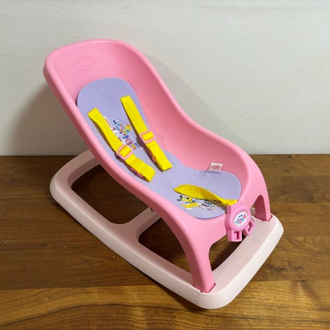 Baby Born lasten lepotuoli, vaaleanpunainen, pehmustettu kangaspinta, metallirunko. Sopii vauvoille ja pienille lapsille. Varustettu irrotettavalla lelupalkilla.
