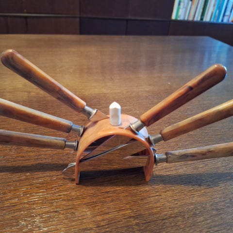 Hedelmä veitsisarja, jossa on puiset kahvat ja puinen teline. Sarja sisältää useita veitsiä, jotka on suunniteltu monipuoliseen käyttöön keittiössä. Puiset kahvat tarjoavat tukevan otteen ja teline helpottaa säilytystä ja käyttöä.