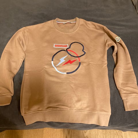 Moncler M neulevalkoinen miesten paita, jossa on puolivetoketju ja korkea kaulus. Materiaali on pehmeää neulosta, ja paidassa on Monclerin logo vasemmassa hihassa. Koko M.
