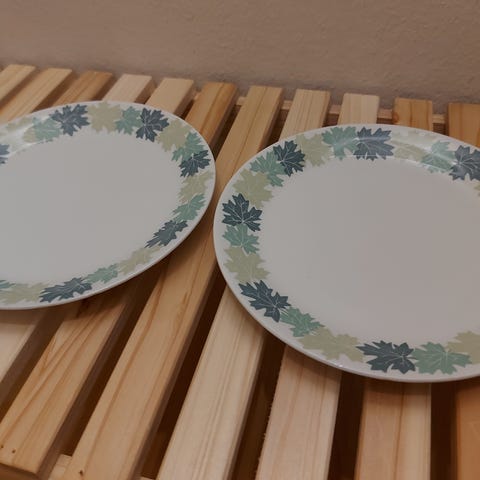Lautasen viehätys piilee sen raikkaassa, kolmivärisessä vaahteranlehtikuviossa, joka tuo mieleen keväisen luonnon. Vaikka se on vintage-esine, se on laadukasta, kovaa fajanssia.