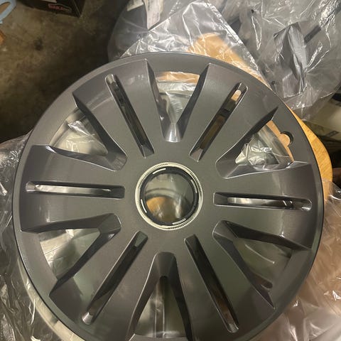 Kuvan alkuperäinen Peugeotin pölykapseli (1 kpl). Etupuolella hieman naarmuuntumista ja maalipinnan irtoilua (katso kuvista). Kaikki kiinnitykset kuitenkin kunnossa. Ilmeisesti sopii seuraaviin malleihin: 207 / 307 / 308 / 406 / 407 / 607 / 807 . Halkaisija n. 44 cm.
