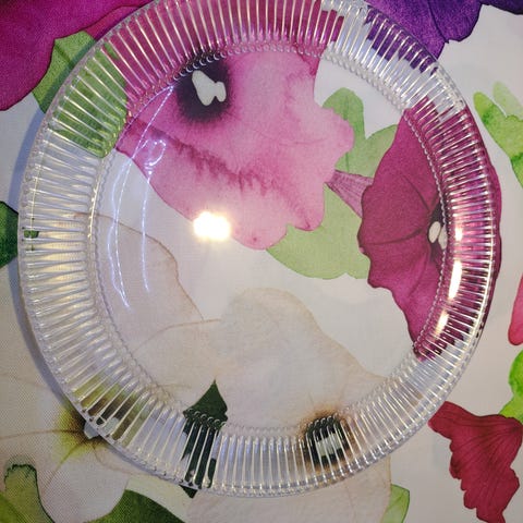 9 kpl Teuvo Lomanin suunnittelemalla printtikuviolla koristettu Räsymatto -sarjan posliinilautanen on 27 cm halkaisijaltaan ja sopii niin arkeen kuin juhlaan.