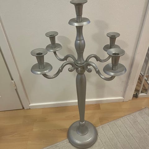 Metallinen musta kynttelikkö, jossa on useita koukkuja ja pyöreitä koristeellisia yksityiskohtia. . Teline on vankkaa metallia ja sopii sisäkäyttöön.