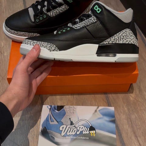 Myydään Air Jordan 3 Retro “Green Glow” -lenkkarit. Kengissä ikoninen elephant print, musta nahkapäällinen ja mintunvihreät (“Green Glow”) yksityiskohdat. Kunto erinomainen — ei isoja kulumia, ei repeämiä ja pohjat hyvässä kunnossa. Täydellinen pari sekä arkikäyttöön että keräilijälle.