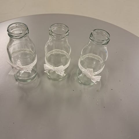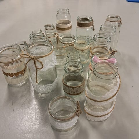 Maalaisromanttiseen tyyliin koristeltuja lasipurkkeja ja pulloja. Olleet hääkoristeina (kukkamaljakoina ja tilan koristeina).