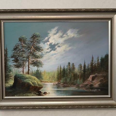 Maisemataulu kullanvärisin kehyksin. Koko 106 x 66.