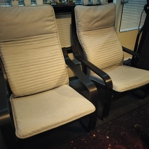 Myydään remontin tieltä musta nojatuoli ja rahi (Poäng)