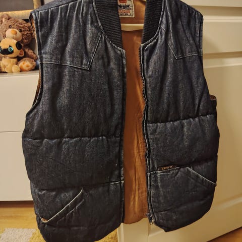 Levi’s tummanruskea vakosamettinen untuvaliivi, koko L. Vähällä käytöllä ollut, uudenveroinen. Vuori puuvillaa, täyte 80% untuvaa, 20% höyhentä. Mittoja kainalo-kainalo n. 63cm, olka-helma n. 72cm.