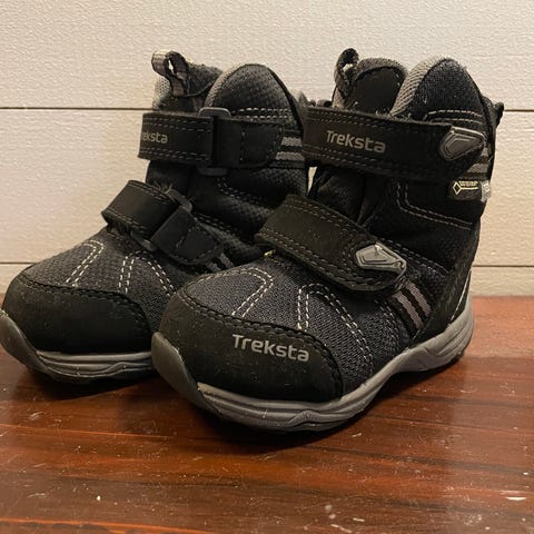 Treksta lasten talvikengät, koko 20, unisex. Mustat kengät, joissa Gore-Tex -kalvo vedenpitävyyttä ja hengittävyyttä varten. Kengissä on tukeva pohja ja tarrakiinnitys, soveltuvat kylmiin ja märkiin olosuhteisiin.