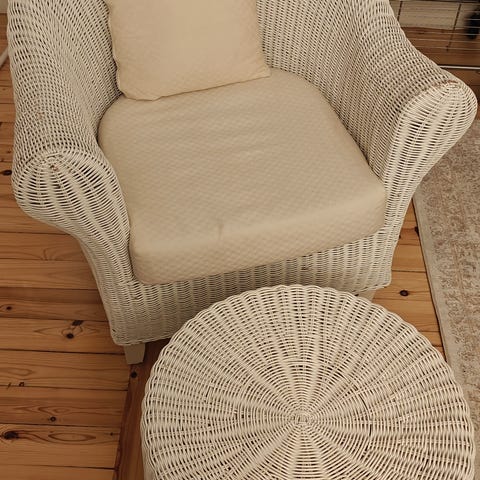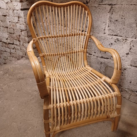 Kuvan kaunis korituoli, syvyys n. 65cm ja leveys käsinojankohdalta n. 67cm. Tämän olen meille hankkinut koiraa varten mutta kyllä kestää vielä ihmisenkin istumisen. Katso kuitenkin viimeinen kuva josta näkyy että tuoliosan rottingissa kulumia/katkenneita kohtia. Niiden vuoksi tämä tuoli olisi sopiva kissalle tai koiralle esim parvekkeelle.. istuinosasta voi tarkkailla maisemia ja aurinkoiselle säällä pääsee varjoon "omaan pesään" tuonne tuolin alaosaan. No joo, meidän koira ei ole osannut arvostaa tätä...