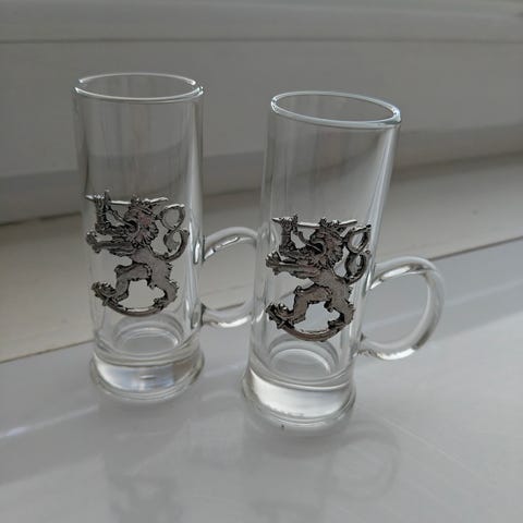 Snapsi-/shottilasit, 2 kpl. Kirkas lasi, jossa Suomen leijonavaakuna, tinaa.