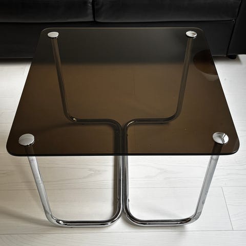 Hakusanat: lasipöytä sohvapöytä kromirunko vintage retro pyöreä pöytä 1970 luku design minimalistic