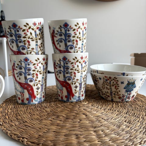 Iittala Taika lautaset 4 kpl 60 € ja kulho 60,00 € ovat monivärisiä ja koristekuvioituja. Valmistettu kestävästä materiaalista. Soveltuu arkikäyttöön ja tarjoiluun. Kuvioissa esiintyy eläin- ja kasviaiheisia elementtejä, jotka ovat osa Taika-sarjan tunnistettavaa designia.