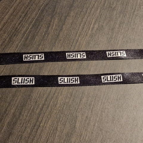 Myydään SLUSH 2025 -messutapahtuman avaimenperänauha mustaa satiinia.