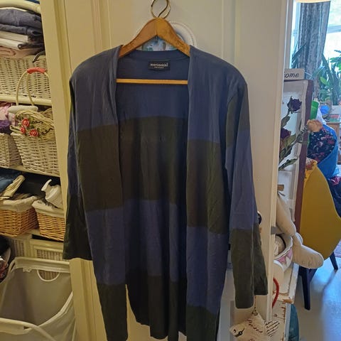 Myydään Jukka Rintalan Marimekolle suunnittelema jakku. Koko M. Kunto kohtalainen. Halkiot sivuilla helmassa, taskut edessä, nappi kiinnitys. Materiaalilappu leikattu irti.