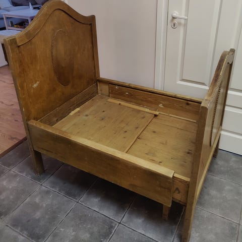 N. 100v vanha puinen päästä vedettävä antiikki sänky, tyyli lähinnä rokokoo. Lyhyimmillään sänky 100cm ja pisimmillään 190 cm. Valkoiseksi maalattu. Maalattu valkoiseksi, hyvässä kunnossa!