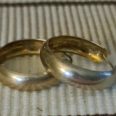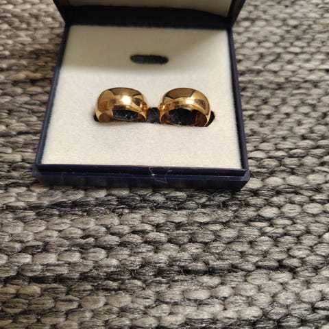 Kauniit koristeuurretut korvakorut. Hieman tummentumaa tapissa ja renkaiden takana. Korvakorut 585 leimalla ja lukot eri korvakoruista, niissäkin leima 14K eli kultaa ovat. Painoa en tiedä enkä arvaile, käyttöön näin upeat eikä romuksi.