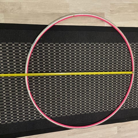 Punainen ja oranssi voimisteluvanne, halkaisija 85 cm. Vanne on valmistettu muovista ja siinä on mukana pinkki suojahuppu. Vanteen voi teipata uudestaan eri väriseksi.