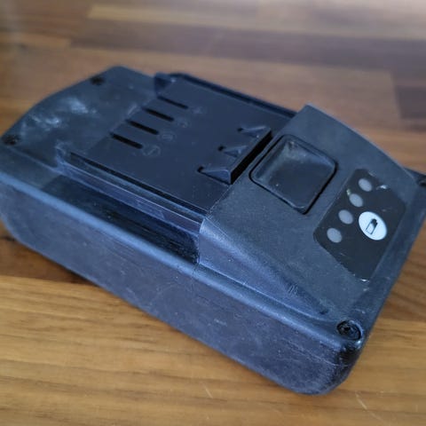 Greenworksin 24V akku. En ole päässyt testaamaan koneessa mutta varausta ainakin pitänyt. Noutaessa voi testata akun, jos omistaa siihen sopivan koneen/laturin.
