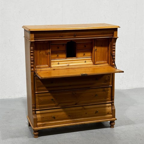 Hyllyssä on kolme alakaappia. Työtason kannen avatessa löytyy sisältä säilytys-/työskentelytilaa, hylly ja leveä laatikko pohjapapereineen. Tason syvyys noin 40 cm ja leveys 80 cm. Oikeassa laidassa vielä neljä vetolaatikkoa. Takana valmistajan leima/paperi. Ainakin yksi avain löytyy.