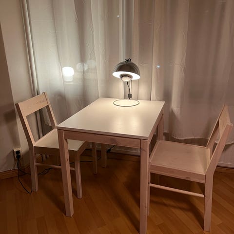Puunvärinen ruokailuryhmä sopii pieneenkin tilaan. Hyvässä kunnossa, jalat metallia.