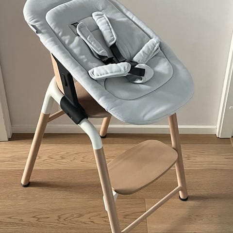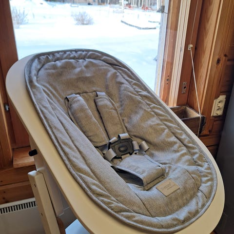 Otsikon mukainen syöttötuoli tornado gray sävyssä, uutta vastaavassa kunnossa.
