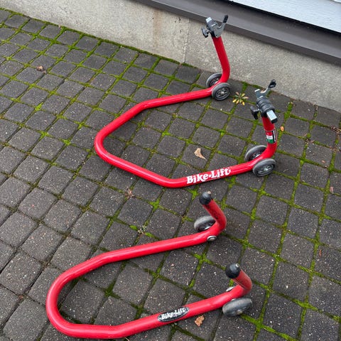 Myydään 2 kappaletta moottoripyörän huoltopukkeja. Toisen oteleveys 21-28cm ja toisen 27,5-34,5cm. 20€/kpl