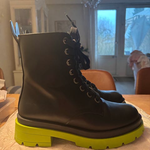 Minna Parikka Saappaat koko 36 (reilu) valmistettu punaisesta nahasta. Saappaissa on mustat joustavat sivuosat ja paksu musta pohja, joka tarjoaa kestävyyttä ja pitoa. Tämä malli sopii kaikille ja on suunniteltu arkeen ja vapaa-aikaan. Kenkiä on koekävelty sisätiloissa muutamia kertoja joten joitain minimaalisia jälkiä voi löytyä jos suurennuslasilla etsit. Mahdollinen vaihto koon 37 Luelloihin.( Muihin väreihin kuin punainen, ne minulla on jo.)