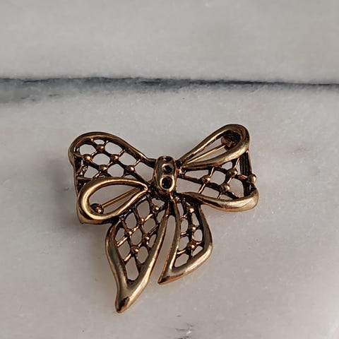 Rusettiaiheinen filigraani rintaneula. Koko noin 35 x 17 mm. Kuulemma kullattua hopeaa, mutta selkeitä leimoja ei löytynyt. Aito vintagekoru, ajanpatinaa, kultaus patinoitunut.