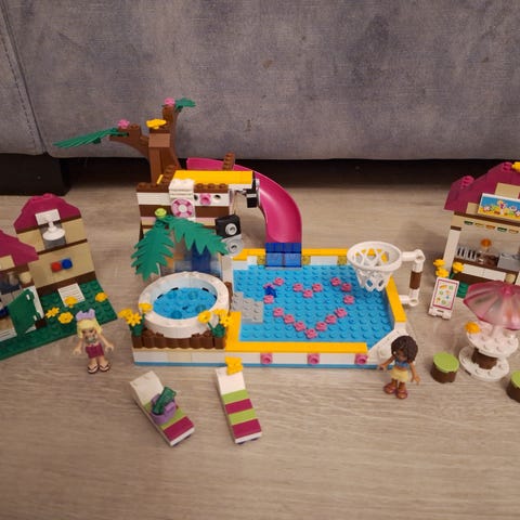 Lego Friends ”Heartlaken kuumailmapallo”, 42097. Muutoin kaikki palat, mutta tuollainen pieni croissant puuttuu. Pakettia teipattu päädystä.