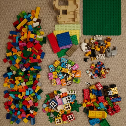 Alustoja, duploja, dinoja, eläimiä, hahmoja ym. Laatikko sisältyy hintaan. Vain nouto.