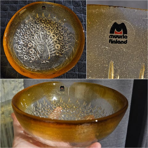 Vintage Muurla Finland design Raija Luoto Riikinkukko sarjan lasinen kulho malja tarjoilu astia jossa on vähän normaalia käytönjälkeä ohuina viiruina lähinnä pohjassa. Katso siis kuvat. Lisään myös muita Riikinkukko astioita myyntiin.