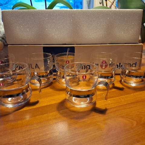 Iittala Paula sarjan lasiset kuumajuomalasit metallisella pidikkeellä. Lasien vetoisuus 30 cl. Setti sisältää kuusi lasia ja myydään yhteishintaan 20€.