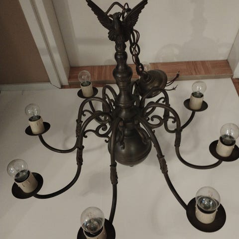 Barokkikruunu, messinkivalaisin, kattolamppu, kattovalaisin, 1900-luku, 6-haarainen messinkiä, toimii, hieno, painava.