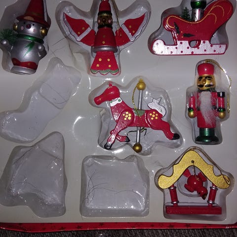 6 kpl kuusenkoristeita settinä. Moitteeton kunto. Halkaisija noin 8 cm.