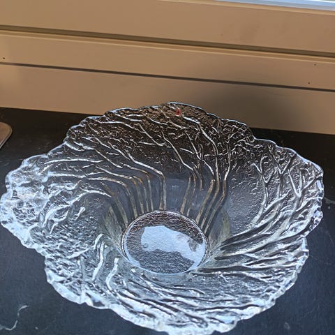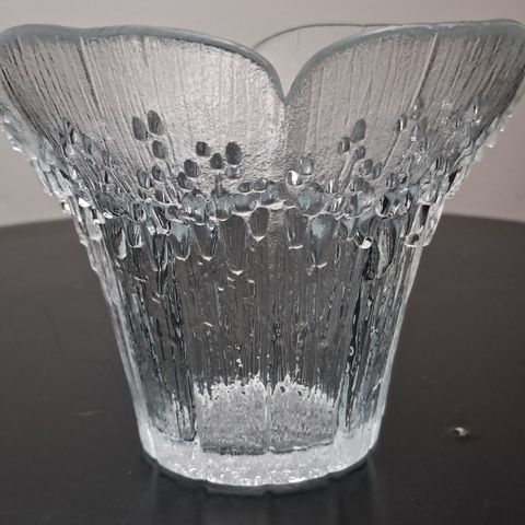 Tämä on Pertti Kallioisen suunnittelema Mäntsälän Lasisepät / Taidelasisepät Koiranputki-sarjan kirkas lasimalja