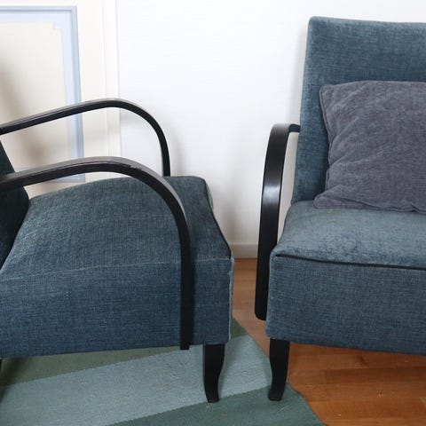 Vintage K nojatuolit 2kpl joissa punainen kangaspäällyste ja puurunko. Tuolissa on kaarevat puukäsinojat ja pehmeä istuin sekä selkänoja.pientä ajan patinaa mutta kuitenkin ehjät, Sopii olohuoneeseen tai lukunurkkaukseen.yht2kpl70e