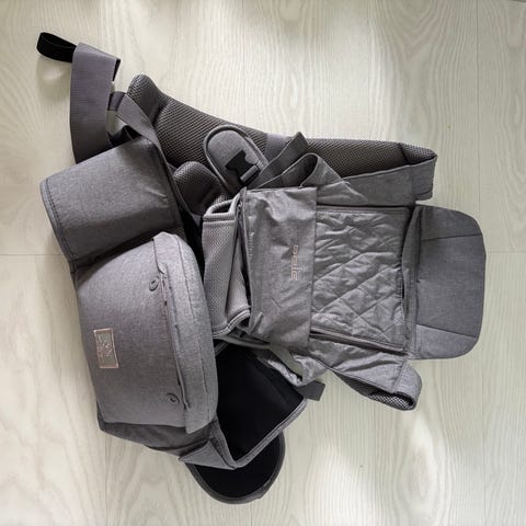 Hyväkuntoinen kantoreppu. Irroitettava sadesuoja. Pysyy pystyssä jalaksen avulla, jonka saa taitettua kasaan.