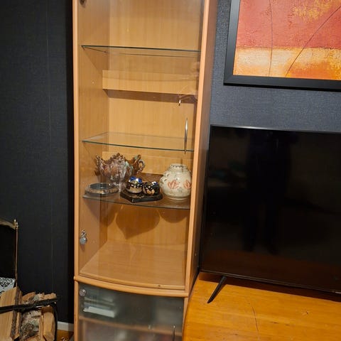 Männystä valmistettu vitriinikaappi etsii uutta tupaa koriste ja miks ei käyttötavaraa esittelemään. Laatikoihin ja umpiovien taakse voi sitten hieman arempaakin esinettä uteliailta katseita piilottaa…